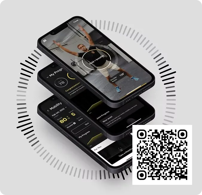 This assessment uses computer vision to deliver a quick, objective, automated and easily repeatable movement assessments to quantify how your body moves. You'll get mobility, symmetry, posture, and stability scores you can track over time. Download the app using the QR code to get started.